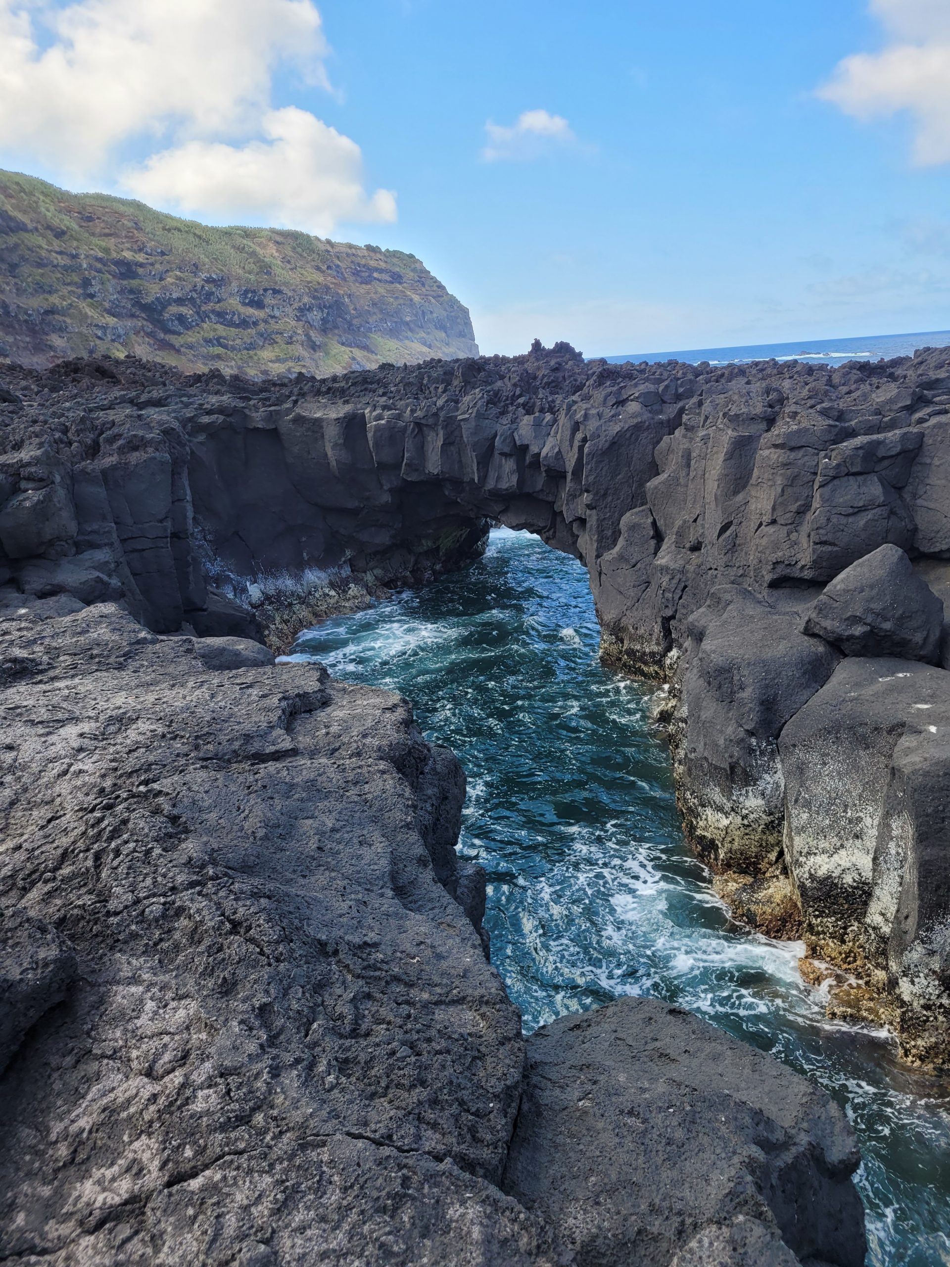 Después continuaríamos de viaje otros 30 minutos hasta el parking de la piscina de Agua Termal. Para que haya menos riesgo, hay que estar pendiente de las mareas y llegar antes de la marea intermedia, aunque hay unas cuerdas a las que te puedes agarrar y no creo que haya mucho problema. En nuestro caso la marea baja era sobre las 6 y la alta a las 12, por lo que llegamos sobre las 9. También decidimos ir por la mañana para que hubiera menos gente. Nos bañamos prácticamente solos.